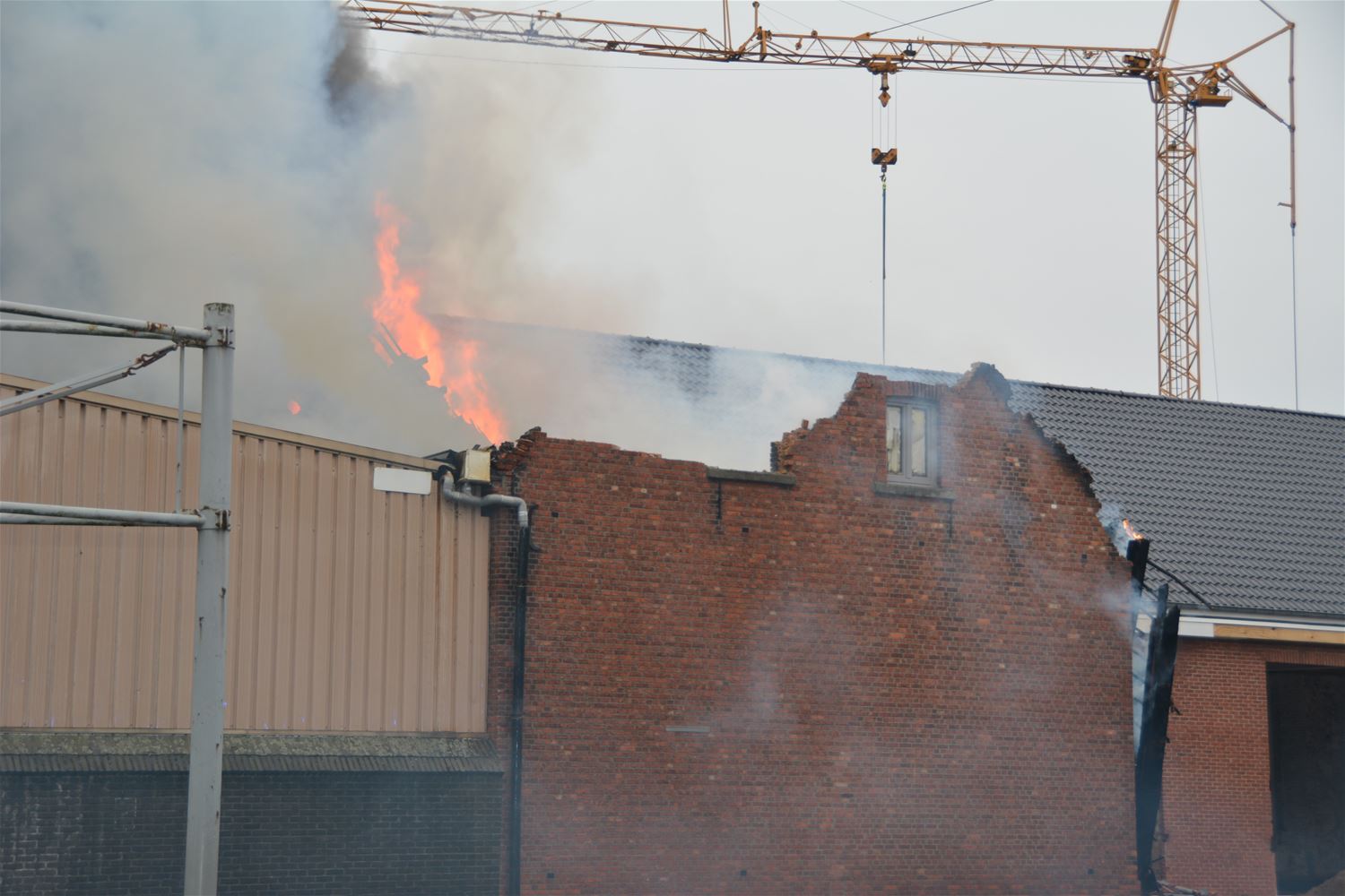 FLASH Er woedt een zware brand in de school aan de Brugstraat. Het is nog niet duidelijk op dit moment waar het vuur precies is ontstaan en of de kleuterschool of lagere school is getroffen. De donkere rookpluim is tot ver te zien. De brandweer is ter plaatse. Het verkeer in de Brugstraat en omgeving zit strop, vermijd best die omgeving. UPDATE De brand woedt in een deel van de kleuterschool. Zoals bekend wordt de school momenteel vernieuwd en uitgebreid, maar het brandt uitgerekend in het oude deel dat bewaard zou blijven. Dat ziet er nu al grotendeels vernield uit, ook het dak is helemaal weg. Vanaf de rotonde aan de kerk moet het verkeer omrijden. UPDATE Er is een BE-Alert verspreid, buurtbewoners worden opgeroepen om ramen en deuren dicht te houden automobilisten moeten de ventilatie uitschakelen. UPDATE Vanavond is de brandweer opnieuw ter plaatste moeten gaan voor een beperkte heropflakkering van de brand. Maar het was snel onder controle.(foto's Marina Poelmans)76774